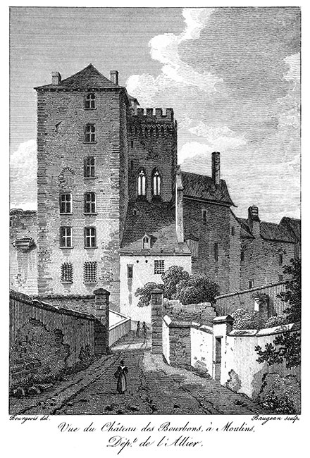 Le château de Moulins, situé à l’extrémité septentrionale de la ville, était autrefois un des édifices remarquables du royaume ; dans sa forme irrégulière, il offrait un ensemble vaste et quelques belles parties. En 1327, il ne consistait qu’en une tour carrée, appelée la Mal-Coiffée, qui existe encore ; le reste des constructions fut ajouté à différentes reprises dans le XIVe et le XVe siècle ; du temps de François Ier il était cité comme un des édifices remarquables du royaume. Ce château fut incendié le 3 juin 1755, et le surplus démoli au commencement de ce siècle, à l’exception de la tour, et d’un petit corps de logis construit par Catherine de Médicis, lequel sert aujourd’hui de caserne de gendarmerie.