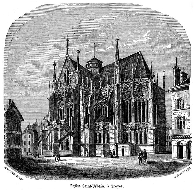 L’ANCIENNE COLLÉGIALE DE ST-URBAIN, citée par Millin comme un des plus beaux morceaux d’architecture gothique, et dont la légèreté surpasse celle de la Ste-Chapelle de Paris, est un édifice élevé par le pape Urbain IV vers la fin du XIIIe siècle. L’abside, le transept et la partie qui forme le rond-point furent seuls achevés en hauteur ; la nef et le vrai portail ne furent jamais élevés au-delà du soubassement du premier étage ; et pourtant cette délicieuse production, qu’on peut dire rivale de la Ste-Chapelle de Paris, n’a cessé d’obtenir, à travers les siècles, un juste tribut d’admiration. Aujourd’hui encore, toute mutilée qu’elle est par les outrages du temps, et bien qu’encastrée dans un scellement de maisons particulières, la ligne gracieuse de sa galerie de pierre, les vives découpures de ses clochetons et de ses pyramides, l’extrême légèreté de ses piliers, les masques et les ressauts de ses gargouilles, attirent la visite des artistes et des voyageurs.